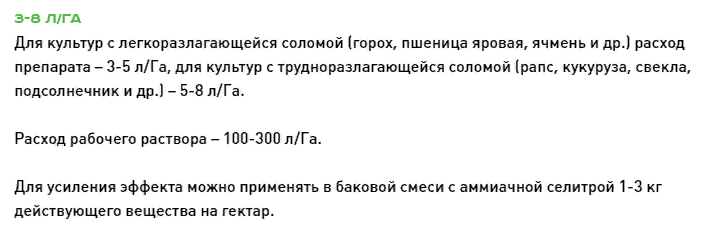 3-8 л/га Для культур с легкоразлагающейся соломой (горох, пшеница яровая, ячмень и др.) расход препарата – 3-5 л/Га, для культур с трудноразлагающейся соломой (рапс, кукуруза, свекла, подсолнечник и др.) – 5-8 л/Га.
