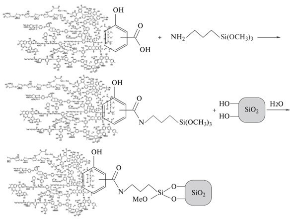 Следующий наш шаг — получение гуминовых производных с повышенной сорбционной способностью на минеральных матрицах. Зачем это нужно? Основное, что останавливает применение гуминовых веществ в природоохранных технологиях: после того как детоксикант вносят в почву и он адсорбирует металл, непонятно, как предотвратить его дальнейшее передвижение. Идеальным решением проблемы было бы заставить гуминовые вещества необратимо прилипать к минеральным поверхностям (например, к песку или глинам). Учитывая, что основная составляющая природных минералов — это кремнезем, то самый удобный способ — создать связь Si—О—Si между гуминовым веществом и минеральной матрицей. Тогда можно получить порошок с поверхностно-активными группами, которые после растворения в водоеме будут прилипать к минеральной поверхности. Вопрос только в том, как это сделать? Казалось бы, все просто: нужно ввести силанольный фрагмент в гуминовый каркас — и дело с концом. Но такие гуминовые вещества в воде будут полимеризоваться, и ничего хорошего из этого не выйдет.