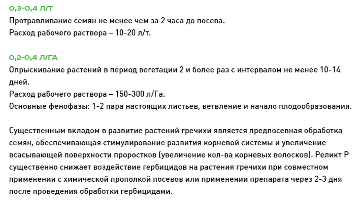 Существенным вкладом в развитие растений гречихи является предпосевная обработка семян, обеспечивающая стимулирование развития корневой системы и увеличение всасывающей поверхности проростков (увеличение кол-ва корневых волосков). Реликт Р существенно снижает воздействие гербицидов на растения гречихи при совместном применении с химической прополкой посевов или применении препарата через 2-3 дня после проведения обработки гербицидами.