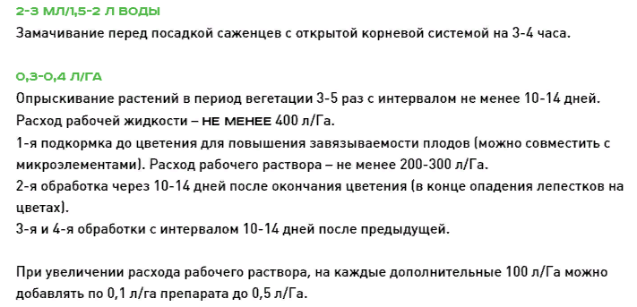 0,3-0,4 л/га Опрыскивание растений в период вегетации 3-5 раз с интервалом не менее 10-14 дней. Расход рабочей жидкости – не менее 400 л/Га. 1-я подкормка до цветения для повышения завязываемости плодов (можно совместить с микроэлементами). Расход рабочего раствора – не менее 200-300 л/Га. 2-я обработка через 10-14 дней после окончания цветения (в конце опадения лепестков на цветах). 3-я и 4-я обработки с интервалом 10-14 дней после предыдущей.